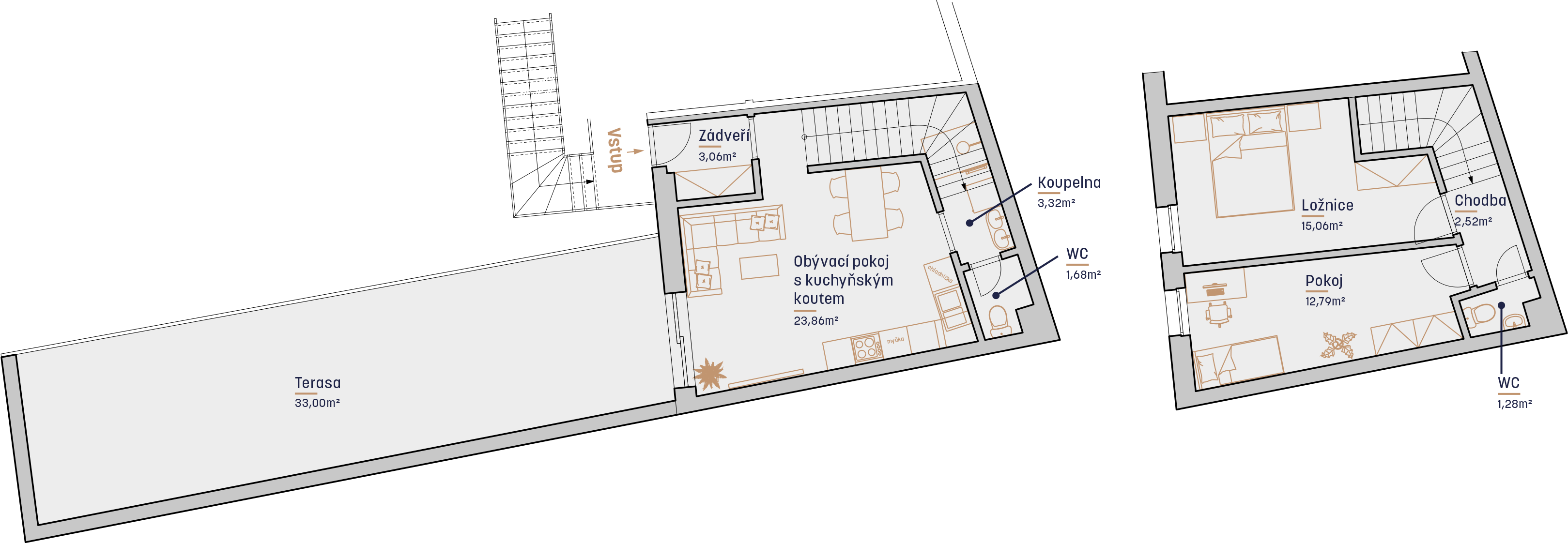 2. a 3. NP23,86 m² 3,06 m² 3,32 m² 1,68 m² 2,52 m² 1,28 m² 12,79 m² 15,06 m² 63,57 m²
